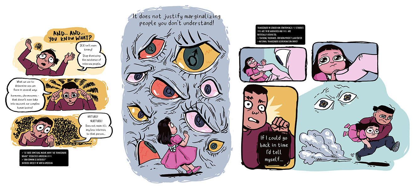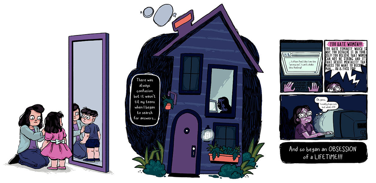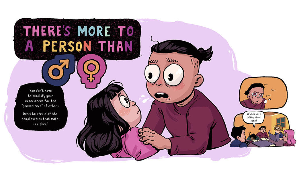 Who You? Who Me? is an exhibition that focuses on and explores gender identity. The body of work featured within the exhibition approaches this topic from a personal perspective. Brain Food and Wheel of Labels seeks to introduce terminology and history. While, Whoever You Are is a narrative exploration.The work stemmed from a long-held and desperate need to have friends and family understand my experience, particularly as someone that felt the binary definition of “man” and “woman” as too restrictive. Brain Food is a product of the early “Introduction to Sex & Gender”, text-only version that I’d send to close friends. One of whom was my collaborator, Juston McKee (on Brain Food). Branching from that same text, Who You? Who Me? incorporates my personal experience. Wheel of Labels was more conceptual realm that gave room to play with concepts of gender within context of time and place, stereotypes that are conjured, and how we may feel about the labels that are put on us. At the same time putting my spin on it as an illustrator by allowing it to be educational and approachable.The show aims to inform in a way that doesn't come across as preachy and distant in order to create a space for dialogue. And so, true to my style, I do so with bright colors, likeable characters, and especially a sense of humor.